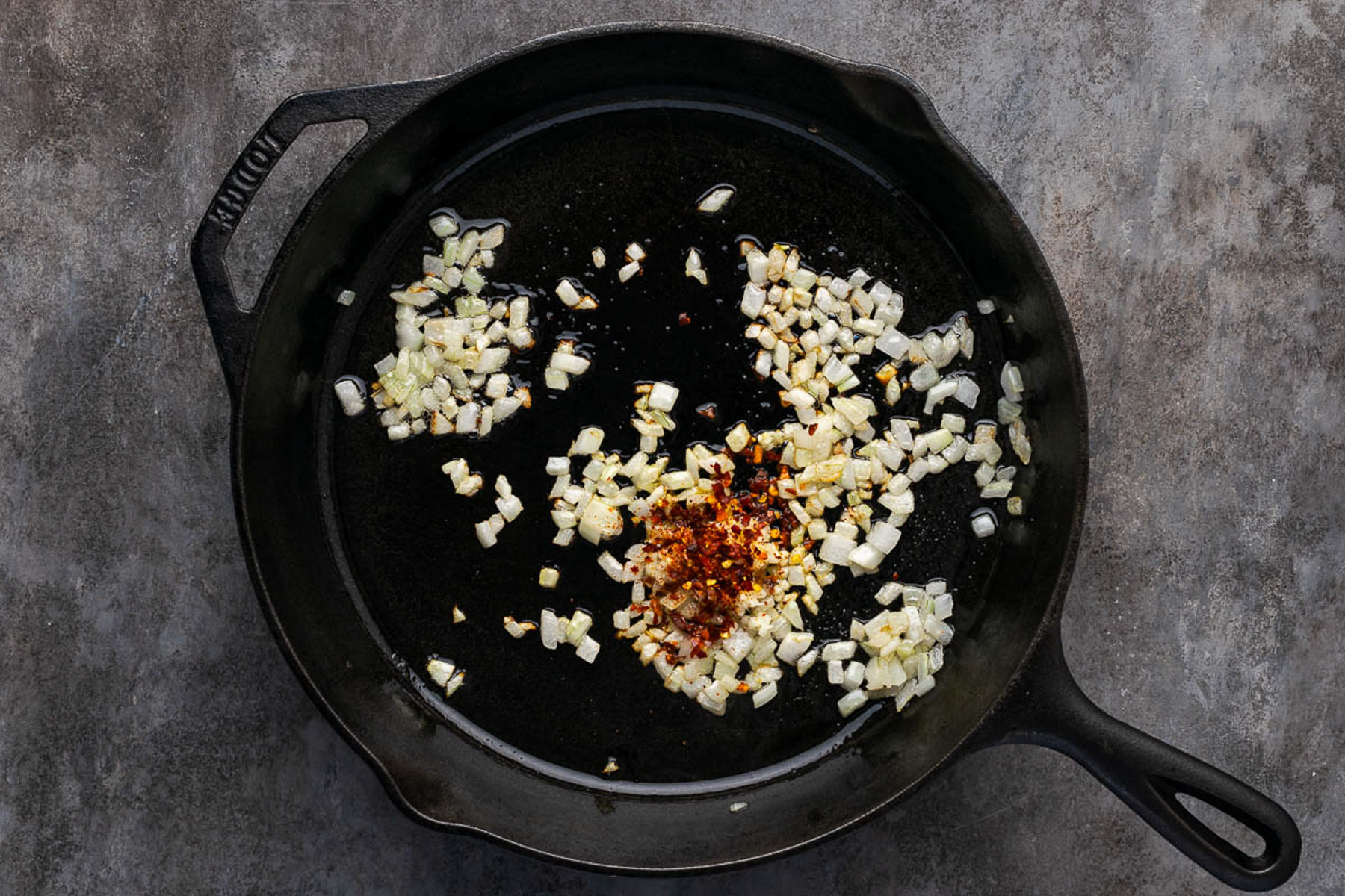- Step 2: Add garlic and spice. Stir in the minced garlic and red pepper flakes, cooking just until fragrant, about 30 seconds.