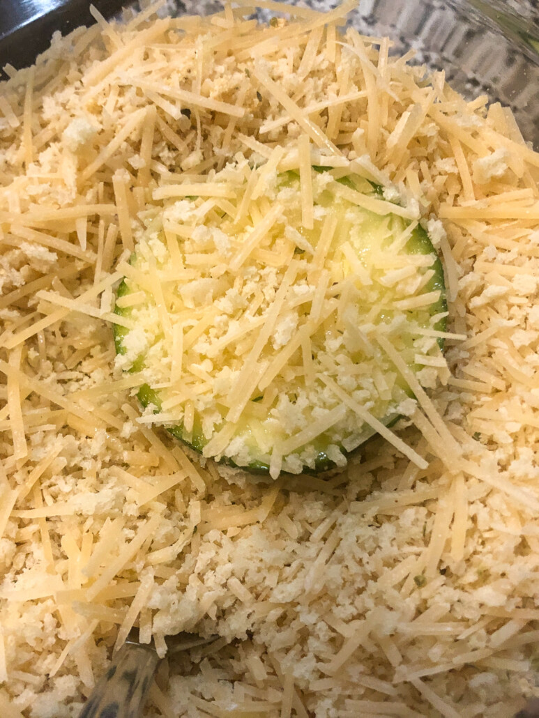Step 4 — Press the oiled zucchini into the breadcrumb mixture on each side.
