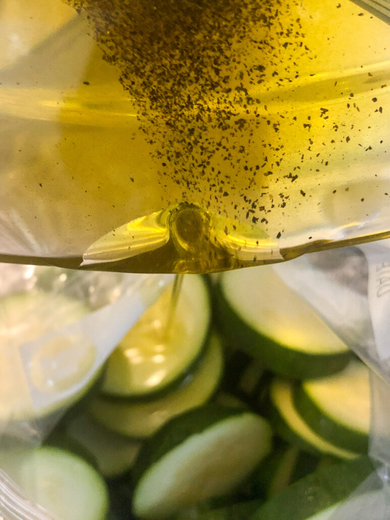 Step 3 — Add the salt and pepper to the olive oil. Toss the sliced zucchini in a bag and pour the seasoned oil in. Seal and shake. We want all the sliced evenly coated.